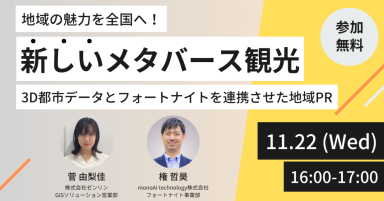 monoAI technologyは、2023年11月22日(水)に「新しいメタバース観光~3D都市データとフォートナイトを連携させた地域PR~」セミナーを開催いたします。