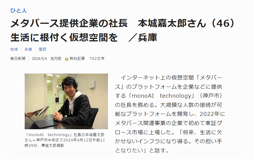 「毎日新聞」にて、当社代表本城のインタビューが掲載されました。 下記よりご覧ください。 https://mainichi.jp/articles/20240504/ddl/k28/070/140000c