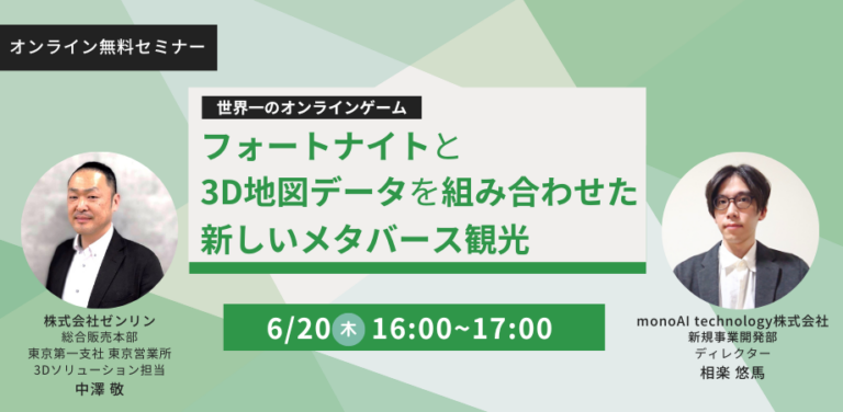 monoAI technologyは、2024年6月20日(木)に「フォートナイトと3D地図データを組み合わせた新しいメタバース観光」セミナーを開催いたします。