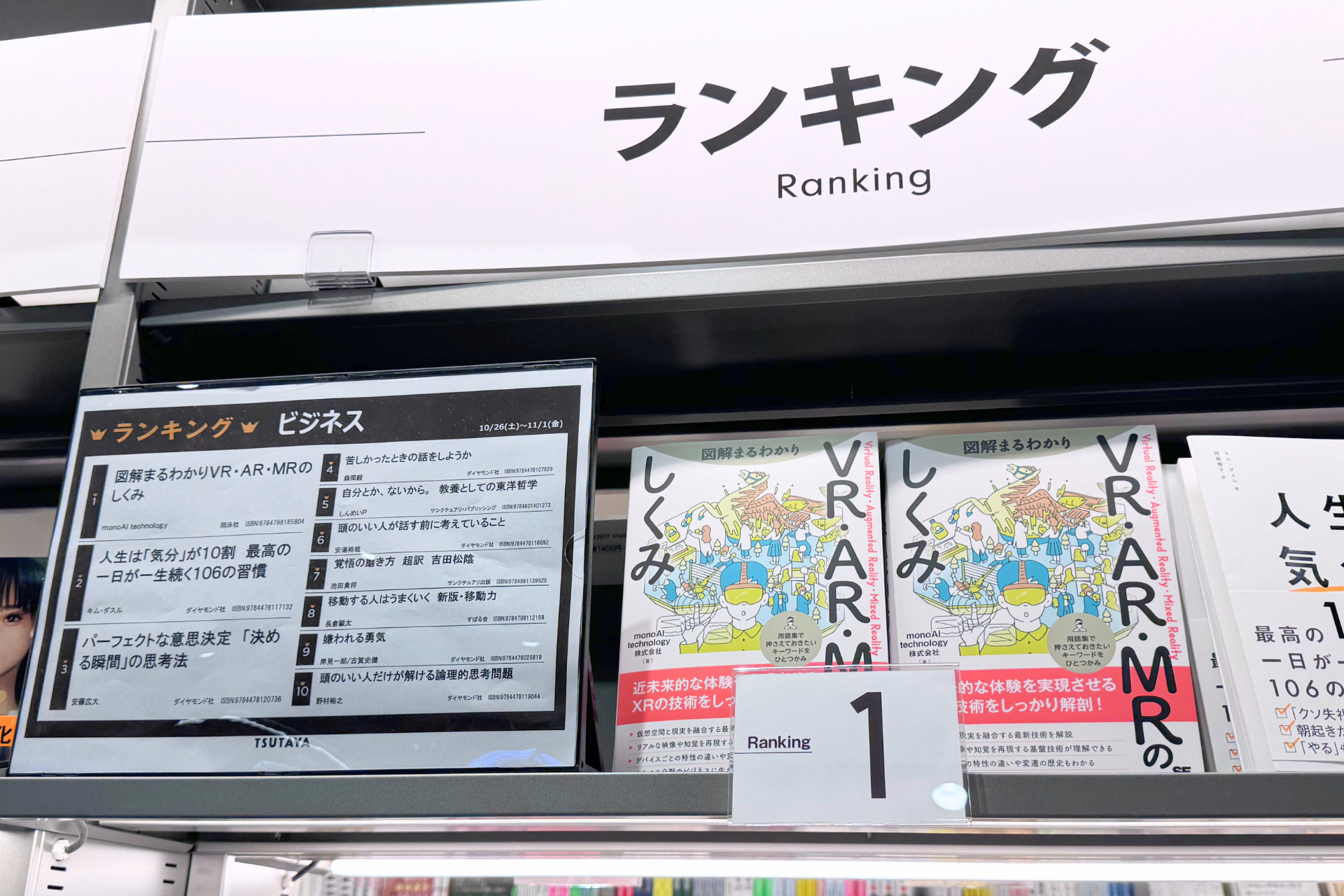 当社が2024年10月17日(木)に発刊したXRの入門書『図解まるわかり VR・AR・MRのしくみ』が、TSUTAYA BOOKSTORE 渋谷サクラステージ店のビジネス書ランキングで1位を獲得したことをお知らせいたします。