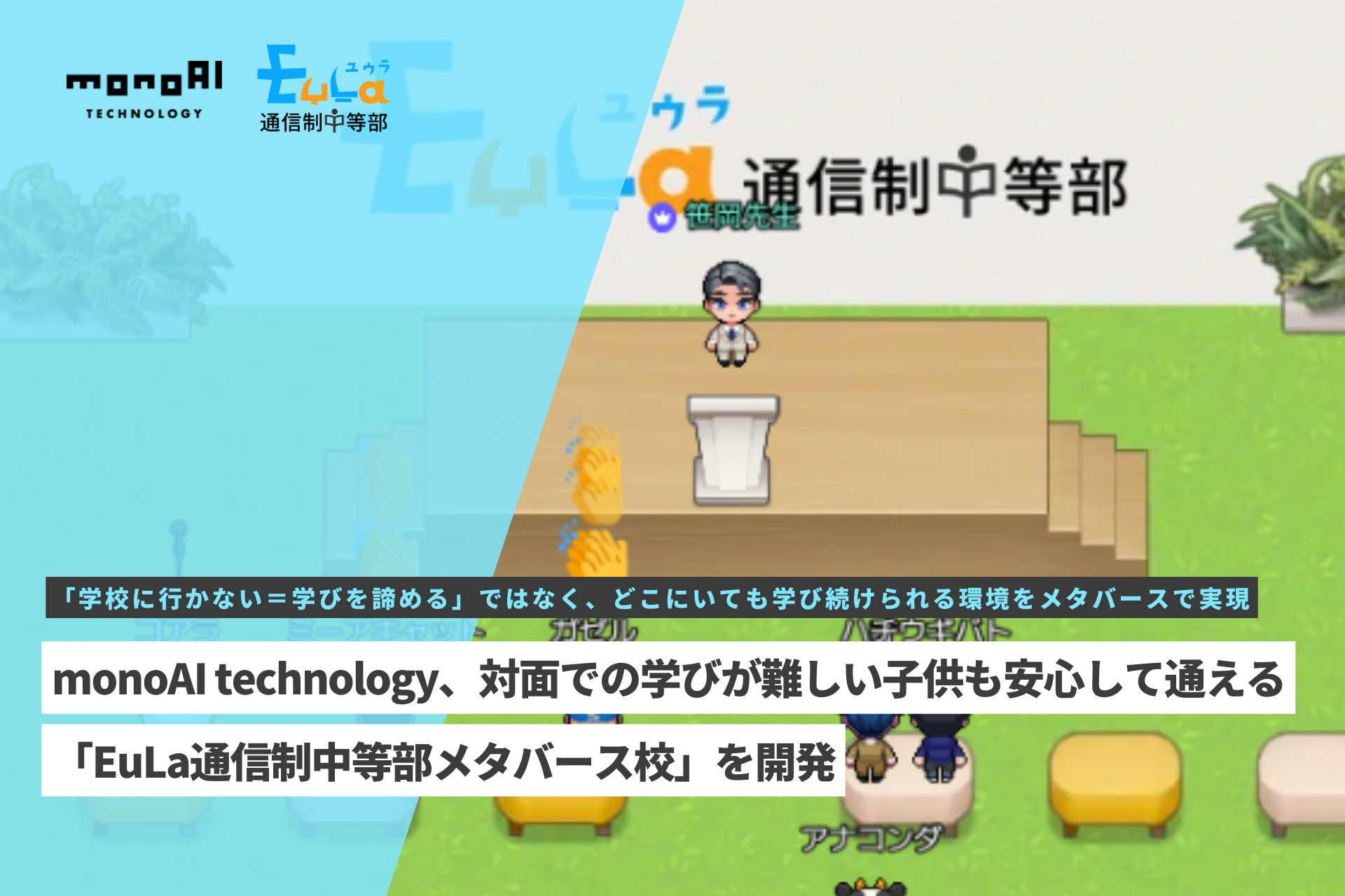 monoAI technology、対面での学びが難しい子供も安心して通える「EuLa通信制中等部メタバース校」を開発~「学校に行かない=学びを諦める」ではなく、どこにいても学び続けられる環境をメタバースで実現~