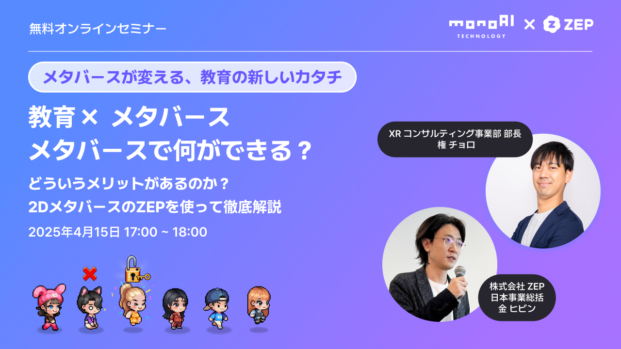 monoAI technologyは、2025年4月15日(火)に「メタバースが変える、教育の新しいカタチ 教育×メタバースでなにができる?どういうメリットがあるのか?2DメタバースのZEPを使って徹底解説」セミナーを開催いたします。