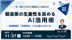 monoAI technologyは、2025年11月27日(木)に「製造業の生産性を高めるAI活用術 ~現場課題を『早期発見』する仕組みの作り方~」セミナーを開催いたします。